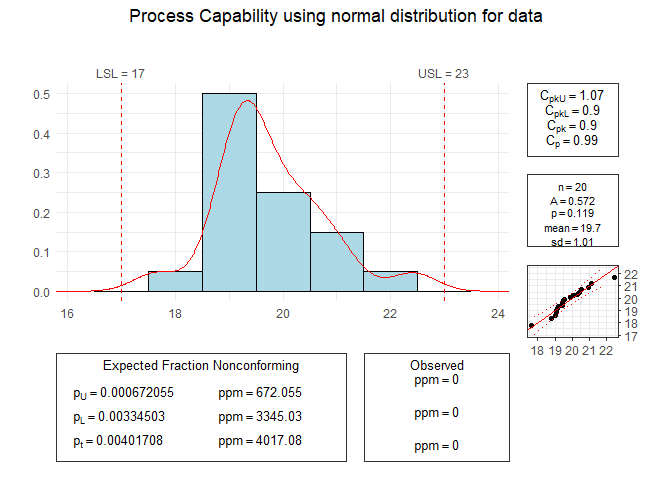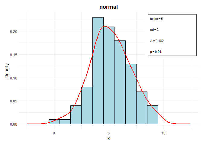 #> A = 0.5722, mean = 19.749, sd = 1.014, p-value = 0.1191