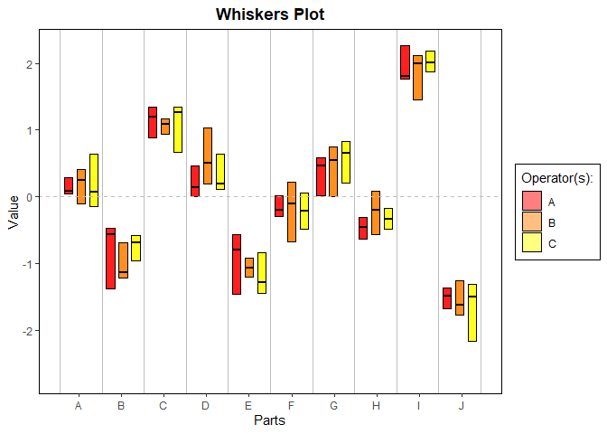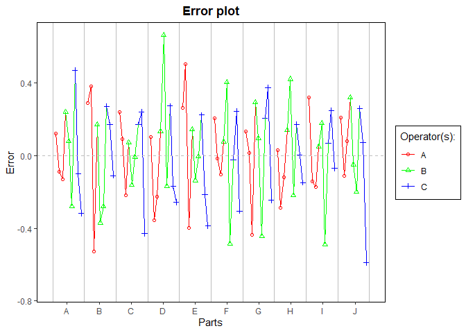 gdo <- gageRRDesign(Operators = 3, Parts = 10, Measurements = 3, randomize = FALSE, method='nested')