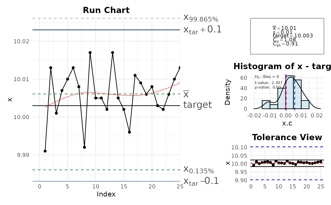cg.RdFunction visualize the given values of measurement in a run chart and in a histogram. Furthermore the centralized Gage potential index Cg and the non-centralized Gage Capability index Cgk are calculated and displayed.