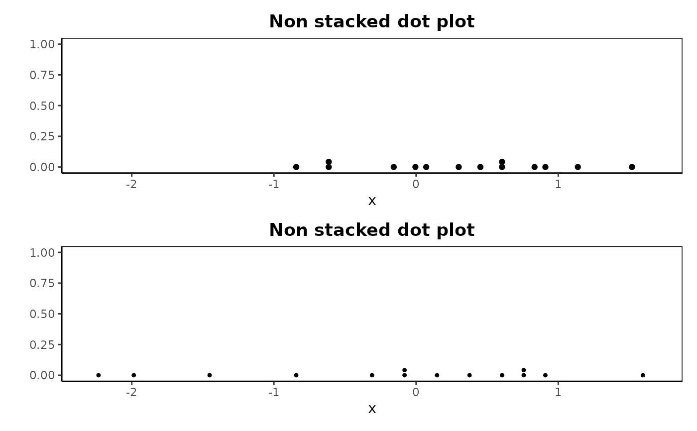 dotPlot(x, group = g, stacked = FALSE, pch = c(19, 20), main = "Non stacked dot plot")
