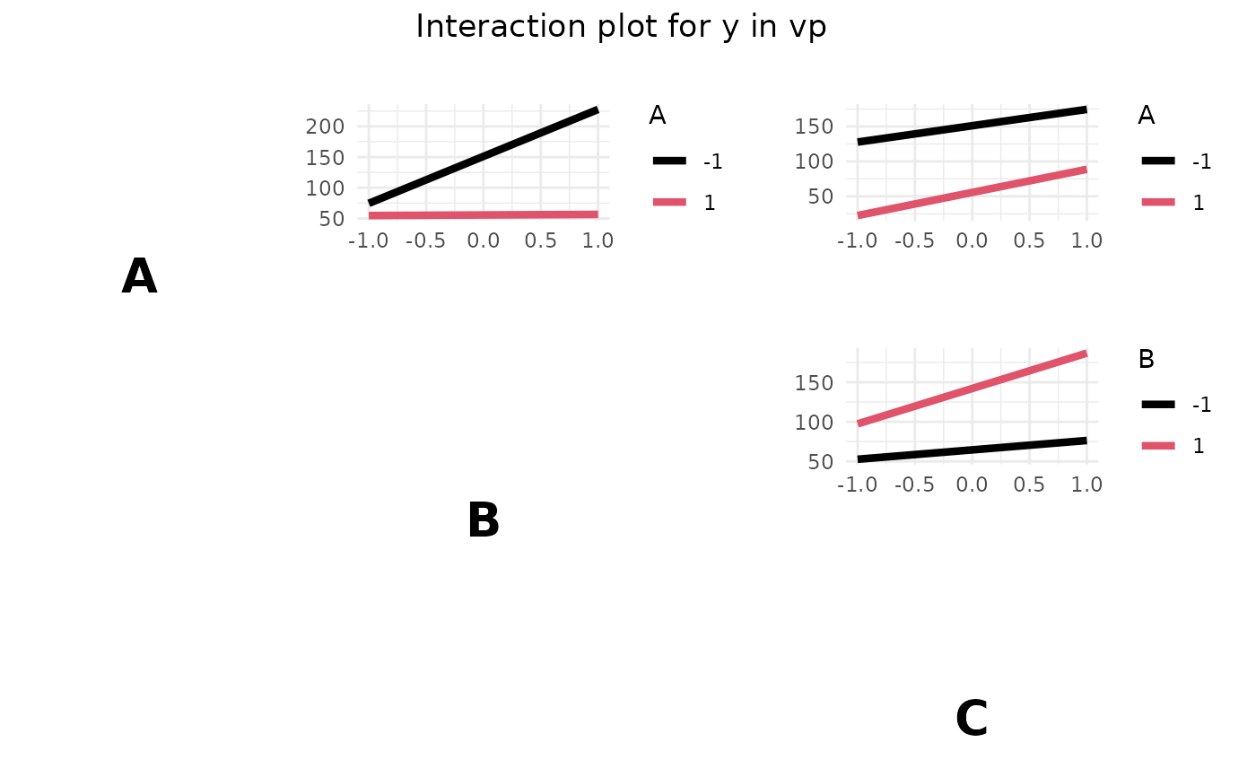 interactionPlot() displays interactions for an object of class facDesign (i.e. 2^k full or 2^k-p fractional factorial design).