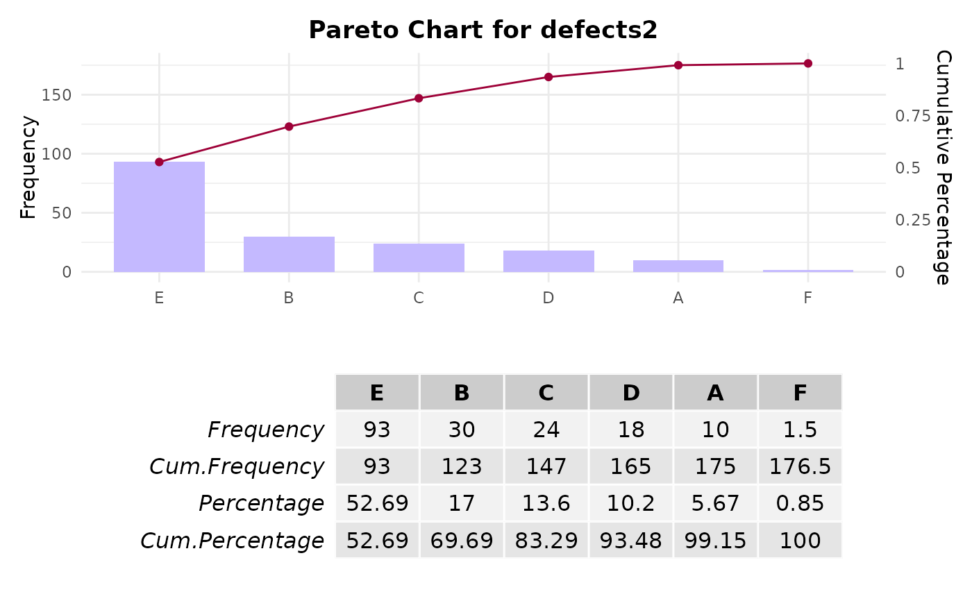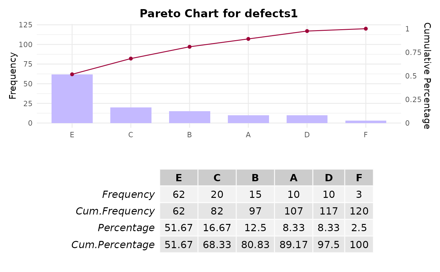 paretoChart returns a Pareto chart along with a frequency table if showTable is TRUE.