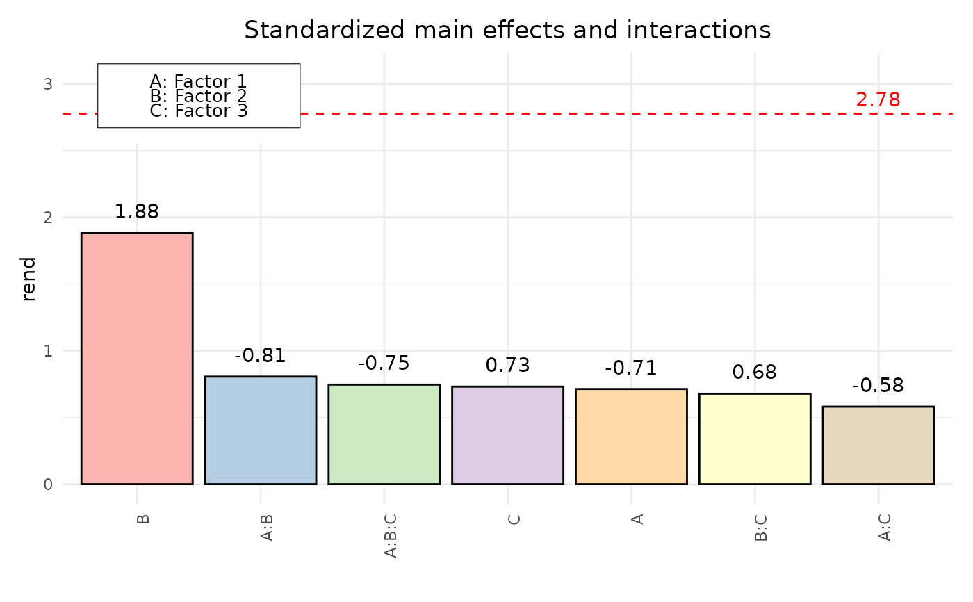 paretoPlot displays a pareto plot of effects and interactions for an object of class facDesign (i.e. 2^k full or 2^k-p fractional factorial design). For a given significance level alpha, a critical value is calculated and added to the plot. Standardization is achieved by dividing estimates with their standard error. For unreplicated fractional factorial designs a Lenth Plot is generated.