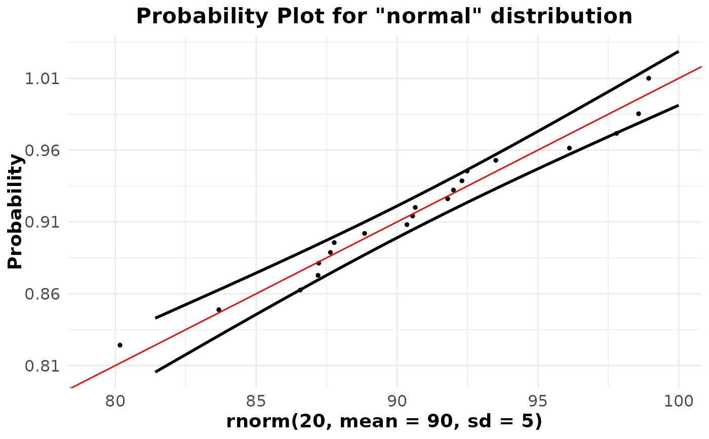 ppPlot(rnorm(20, mean=90, sd=5), "normal",alpha=0.30)