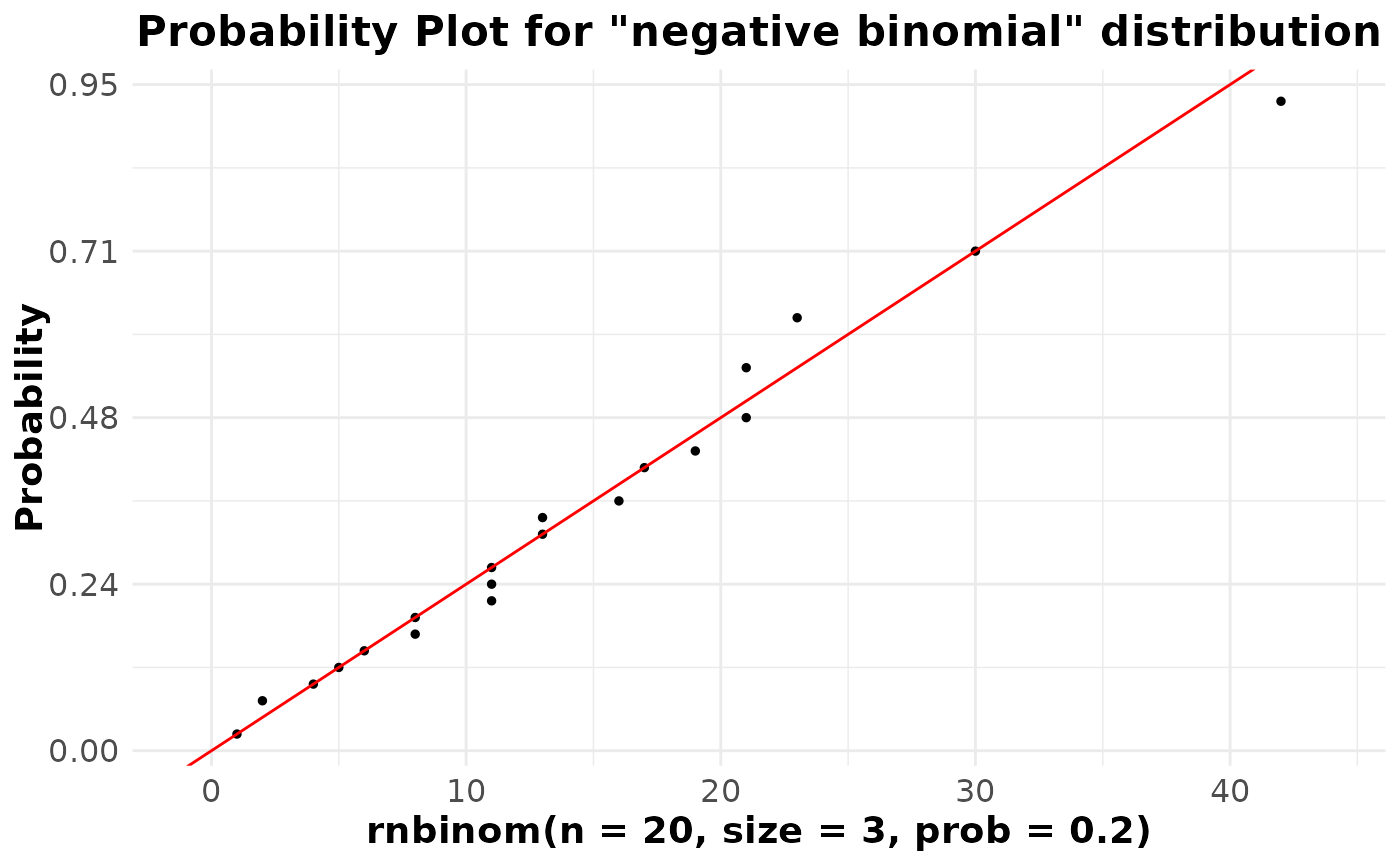 ppPlot(rnbinom(n = 20, size = 3, prob = 0.2), "negative binomial")