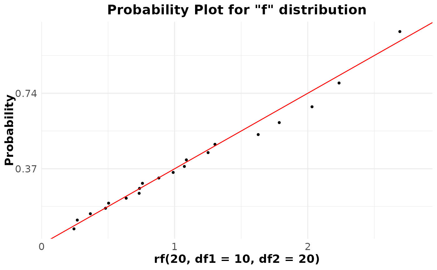 ppPlot(rf(20, df1 = 10, df2 = 20), "f")