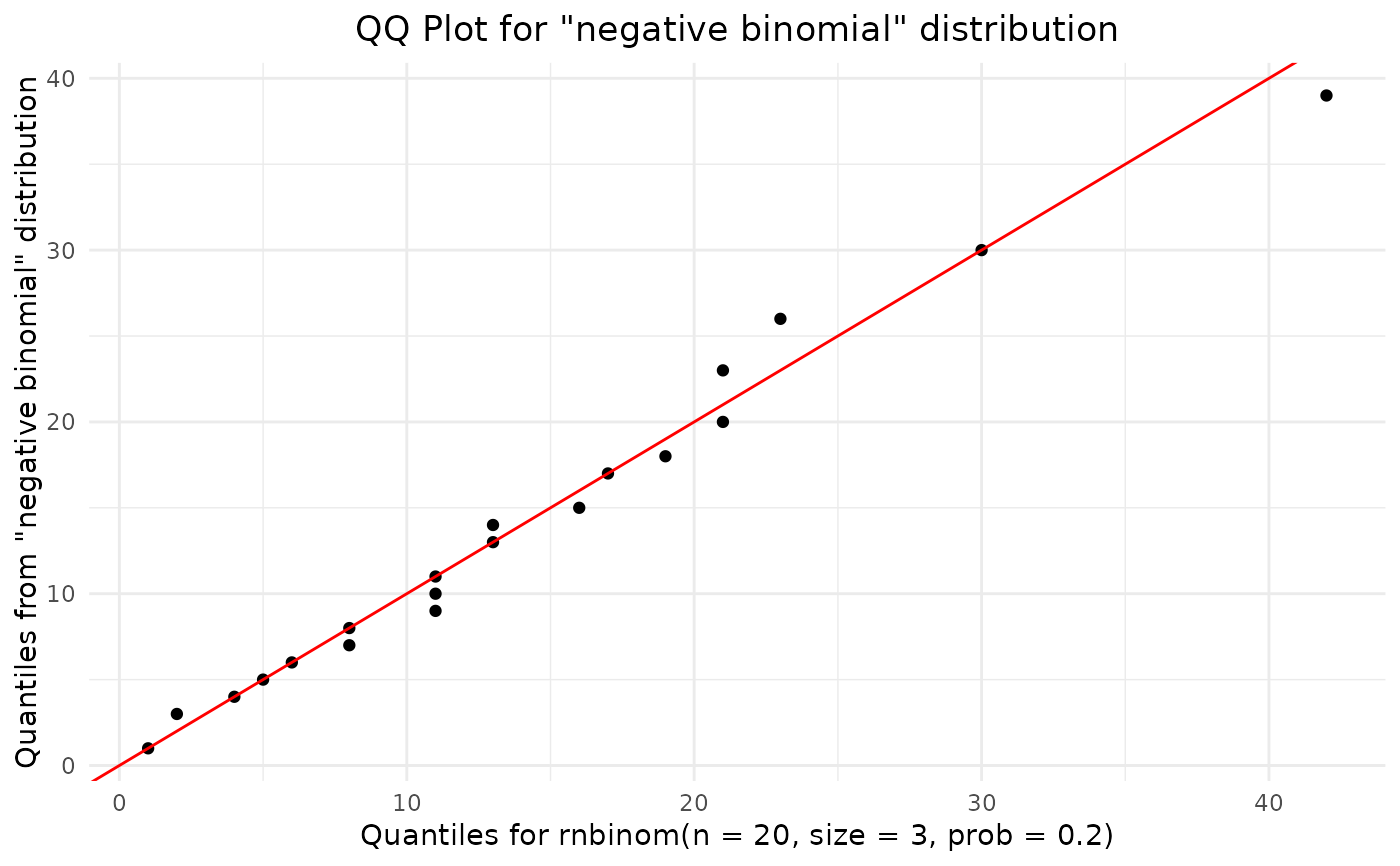 qqPlot(rnbinom(n = 20, size = 3, prob = 0.2), "negative binomial")