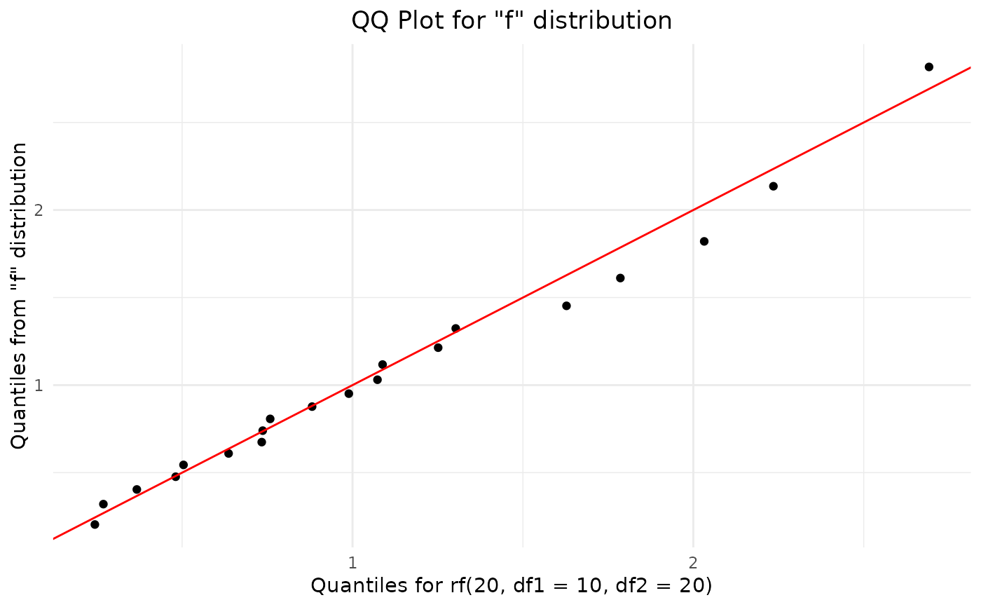 qqPlot(rf(20, df1 = 10, df2 = 20), "f")
