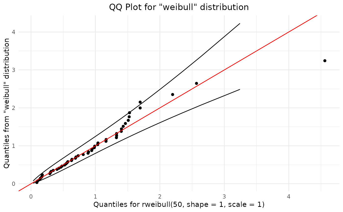 qqPlot(rweibull(50, shape = 1, scale = 1), "weibull")