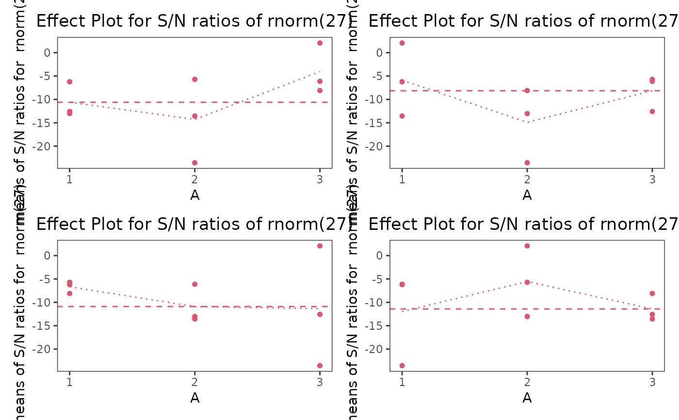 Creates a Signal-to-Noise Ratio plot for designs of type taguchiDesign.c with at least two replicates.